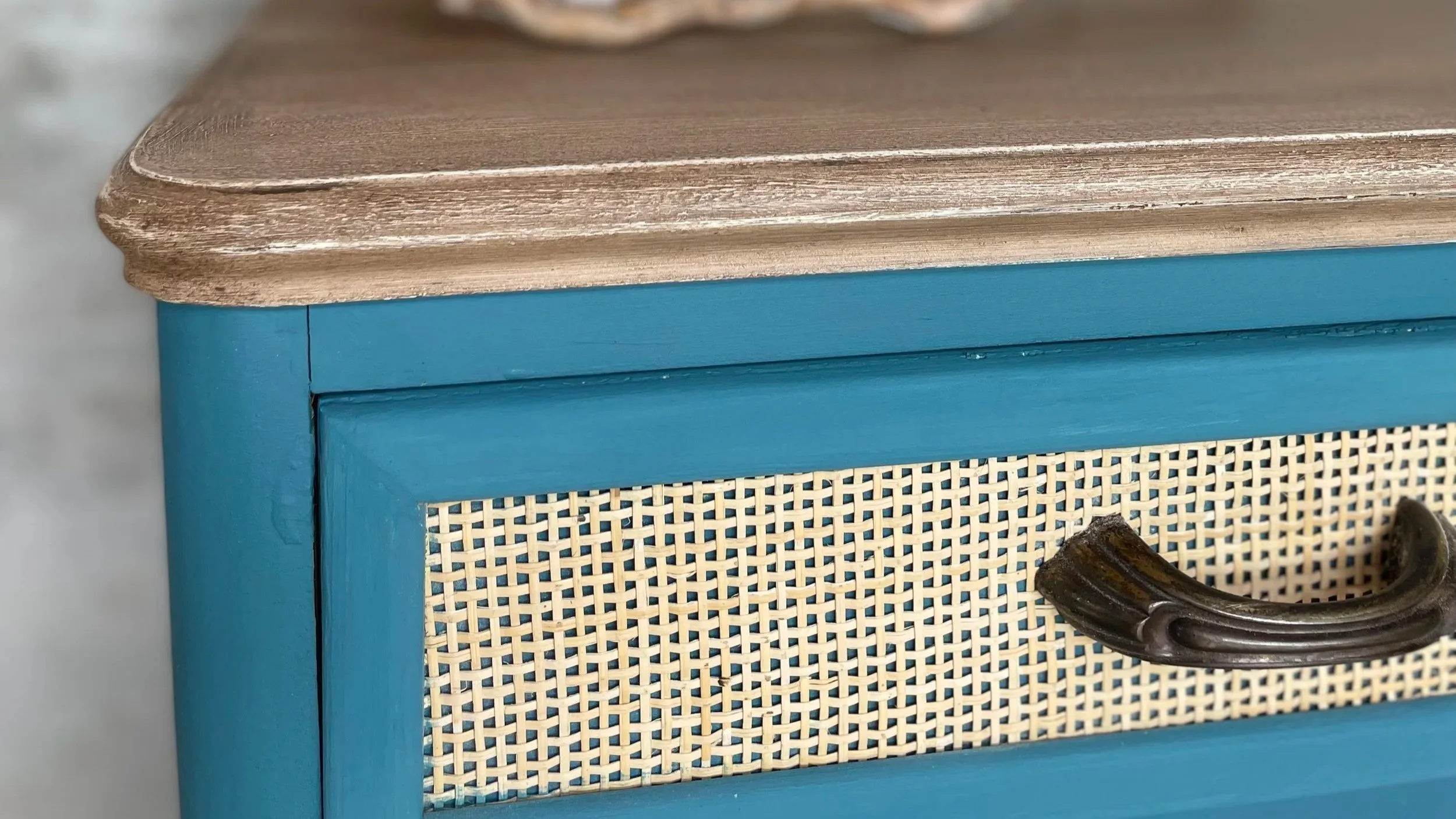Sa tenue bleu pétrole lui apporte ce charme rétro dans l’air du temps. Côté accessoires, il est gâté : un tiroir en cannage, de superbes poignées d’origine pour un look original et coloré.